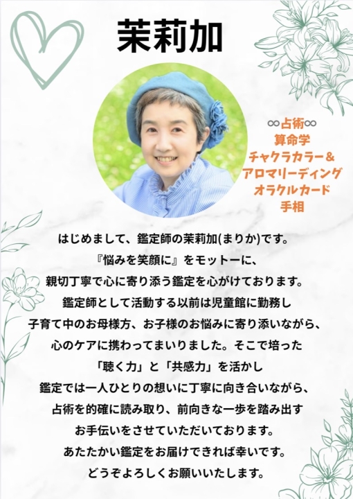 はじめまして、鑑定師の茉莉加です。