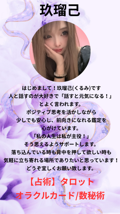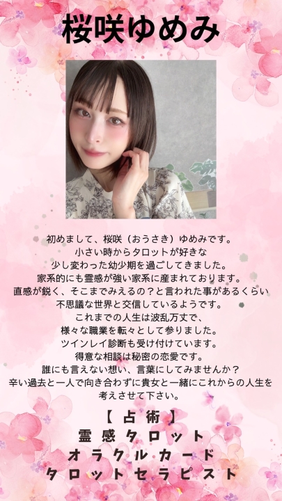 そこで培った「聴く力」と「共感力」を活かし、鑑定では一人ひとりの想いに丁寧に向き合いながら、占術を的確に読み取り、前向きな一歩を踏み出すお手伝いをさせていただいております。あたたかい鑑定をお届けできれば幸いです。 どうぞよろしくお願いいたします。