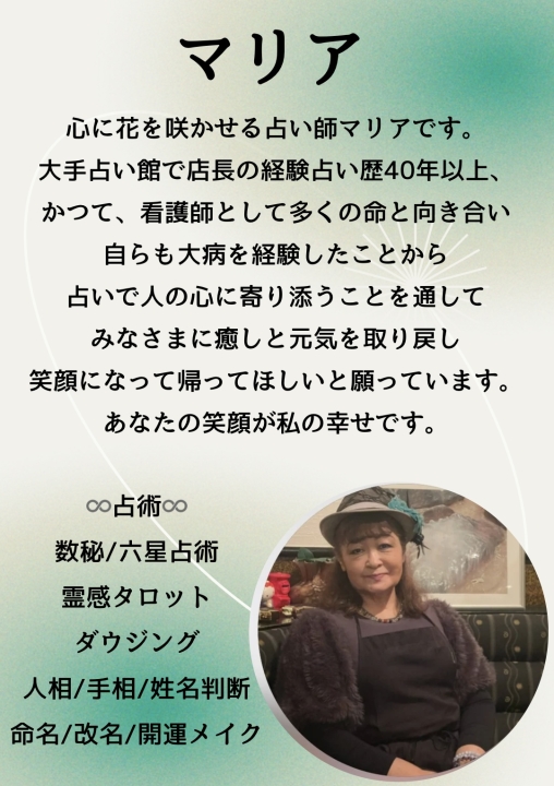 かつて、看護師として多くの命と向き合い、自らも大病を経験したことから、占いで人の心に寄り添うことを通してみなさまに癒しと元気を取り戻し、笑顔になって帰ってほしいと願っています。